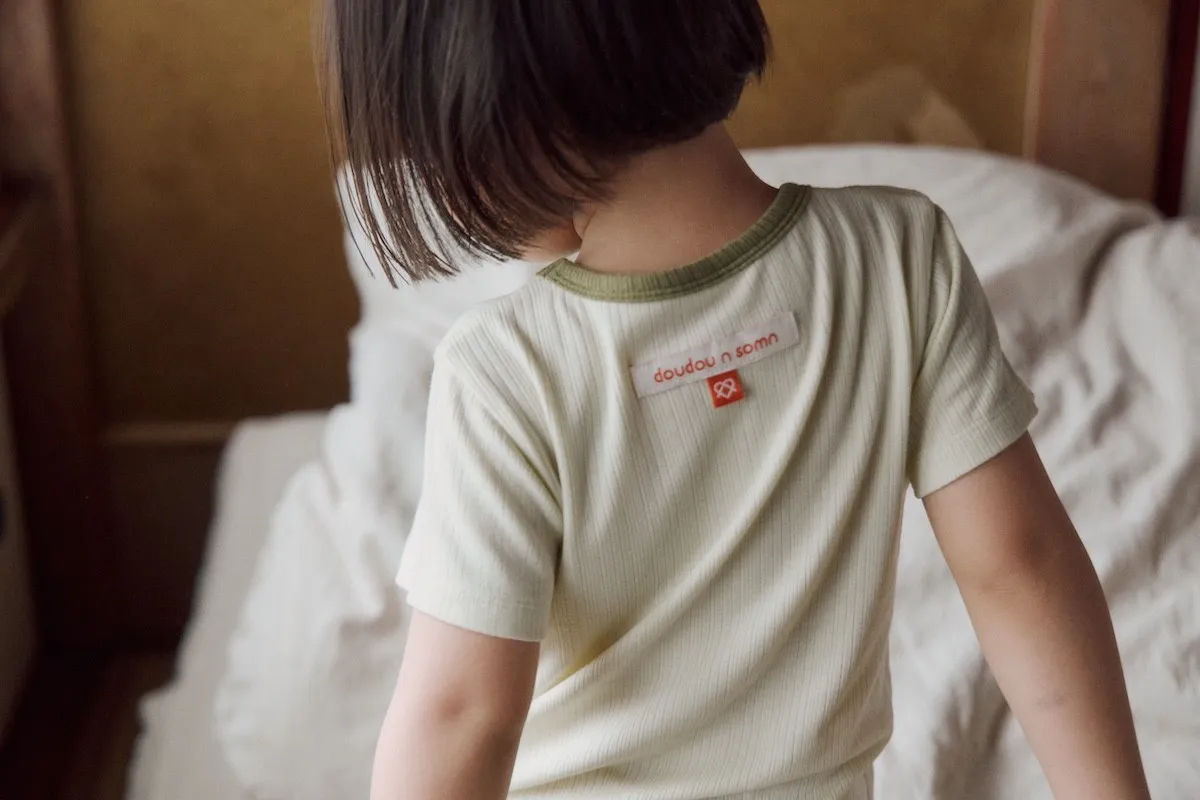 敏感肌、很怕悶熱的寶寶,適合選這一款。採用經認證的 TENCEL™ Modal 原紗,是最舒適的天絲棉材質,具備出色的吸濕排汗特性,手感光滑柔軟、版型合身,豎條紋紋理的布料,帶有彈性非常舒適。顏色是想咬一口的慕斯溫醇色系,三色拼接設計呈現Doudou專屬調色魔法的配色風格,適合日常與上學穿搭。