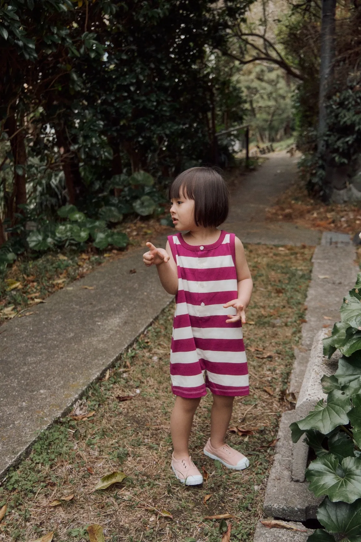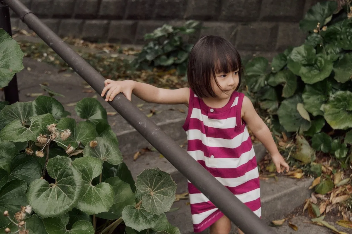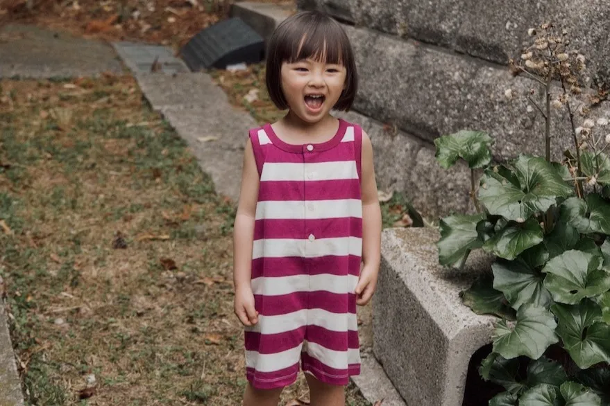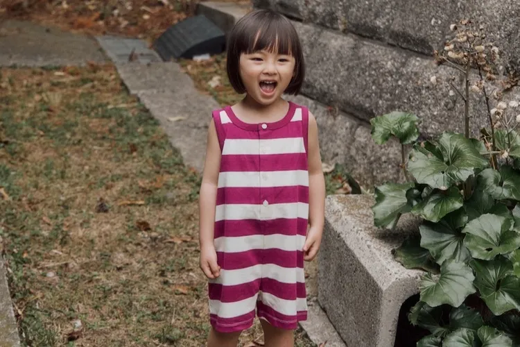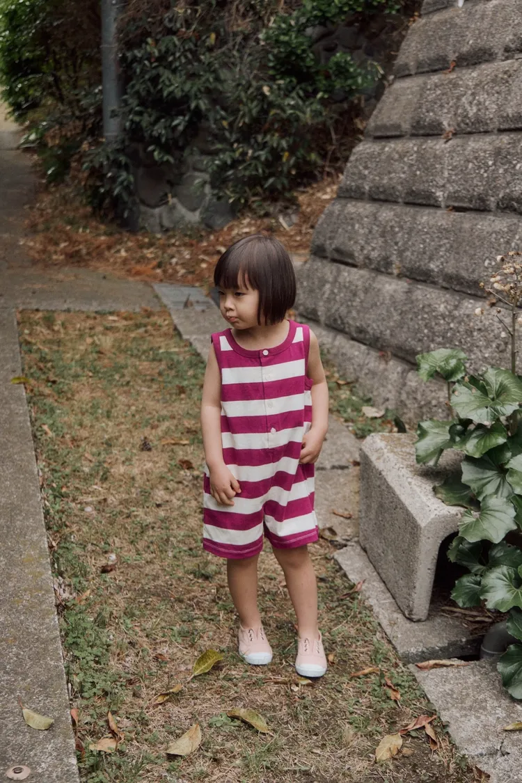 以紫色條紋與寬鬆版型結合的設計,可愛的連身衣。領口與袖孔線條採用同色收邊,呈現復古輪廓的設計感。採用柔軟且具彈性的材質製作,讓孩子穿著舒適,在炎熱的夏季也能輕鬆穿著,活動時也不會有負擔。