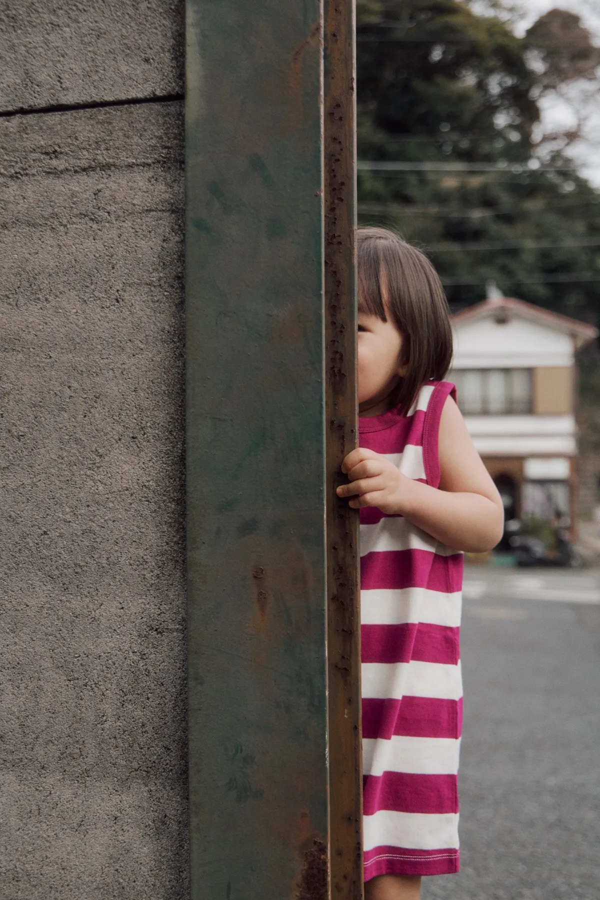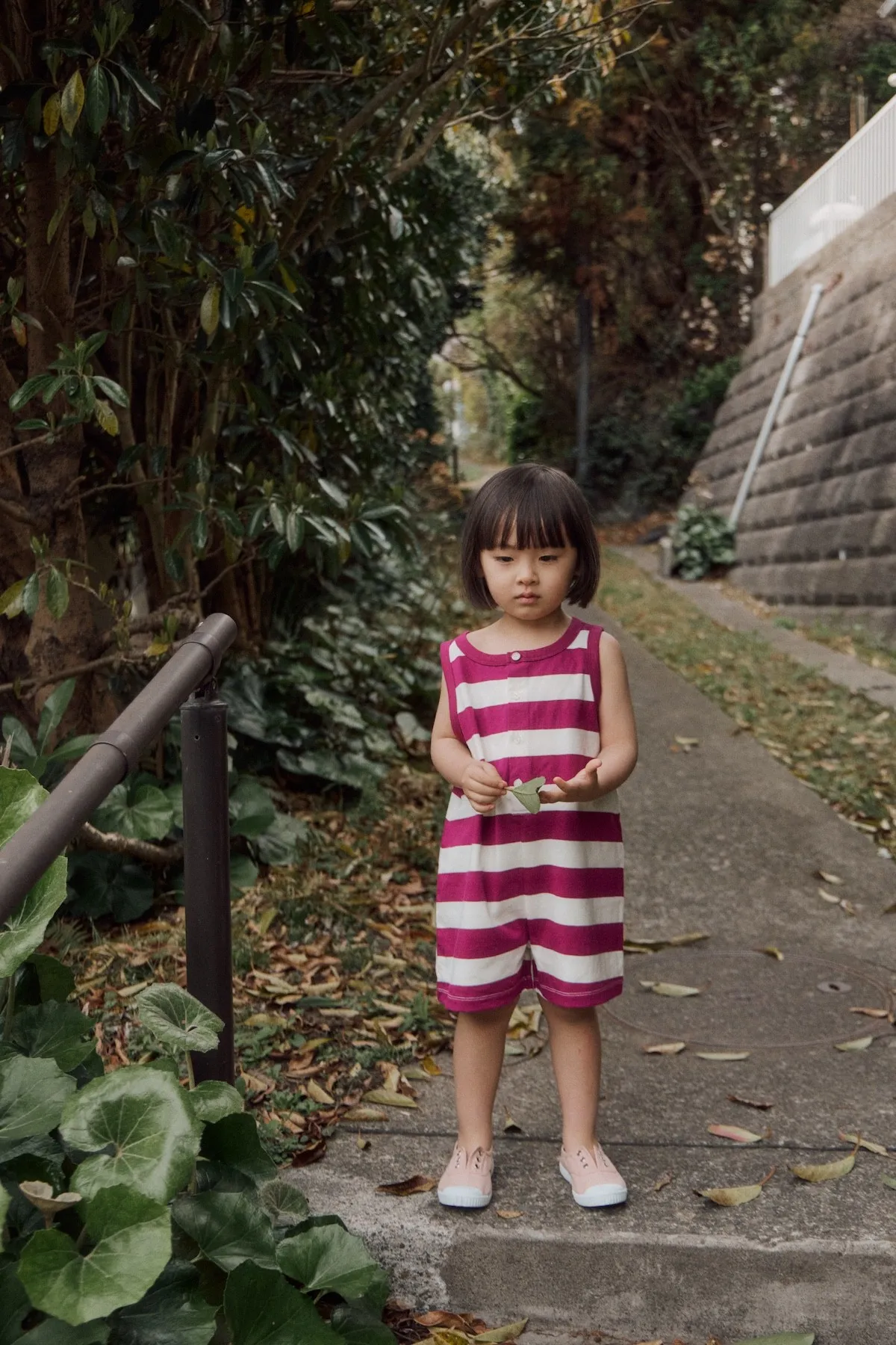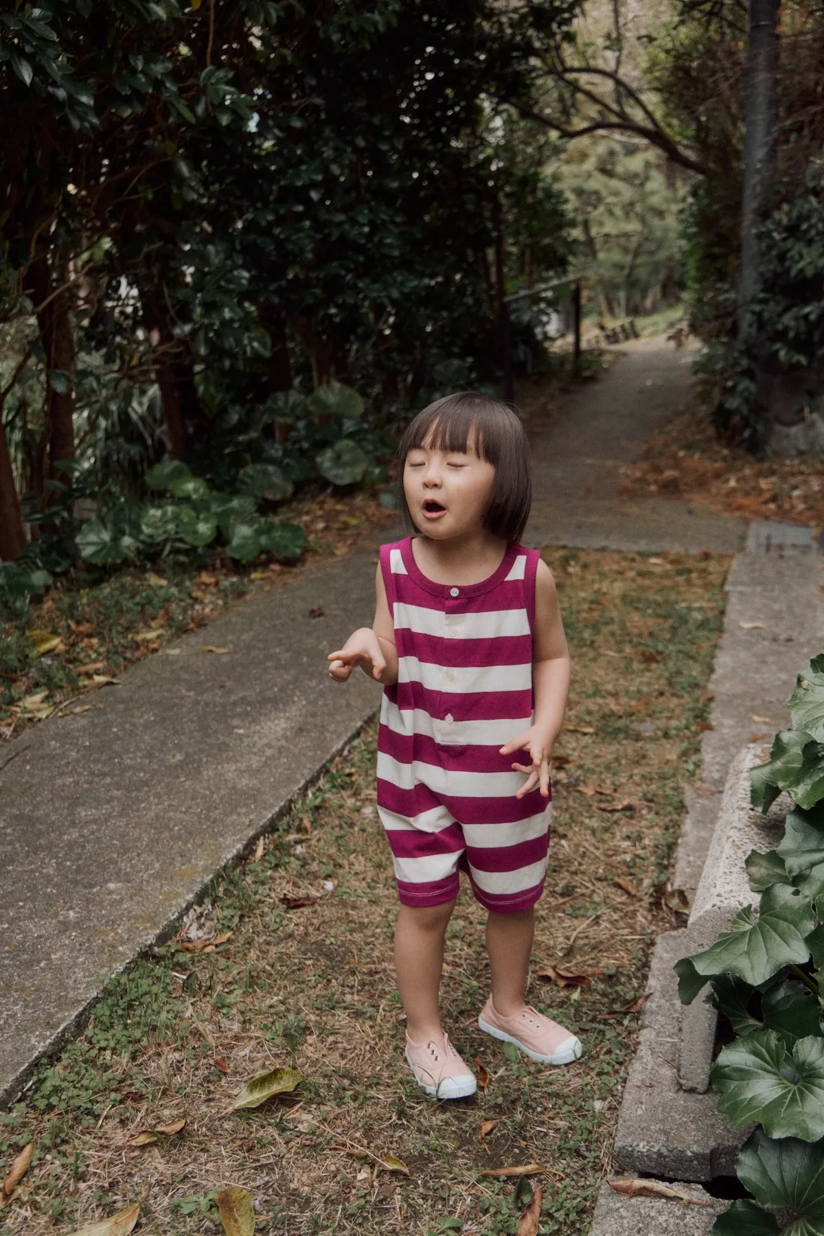 以紫色條紋與寬鬆版型結合的設計,可愛的連身衣。領口與袖孔線條採用同色收邊,呈現復古輪廓的設計感。採用柔軟且具彈性的材質製作,讓孩子穿著舒適,在炎熱的夏季也能輕鬆穿著,活動時也不會有負擔。