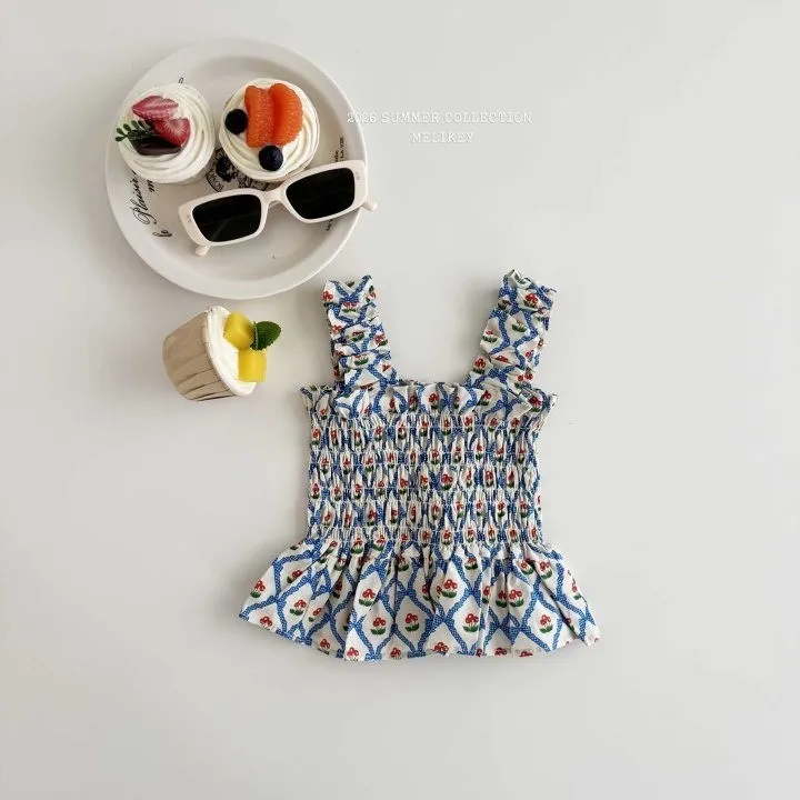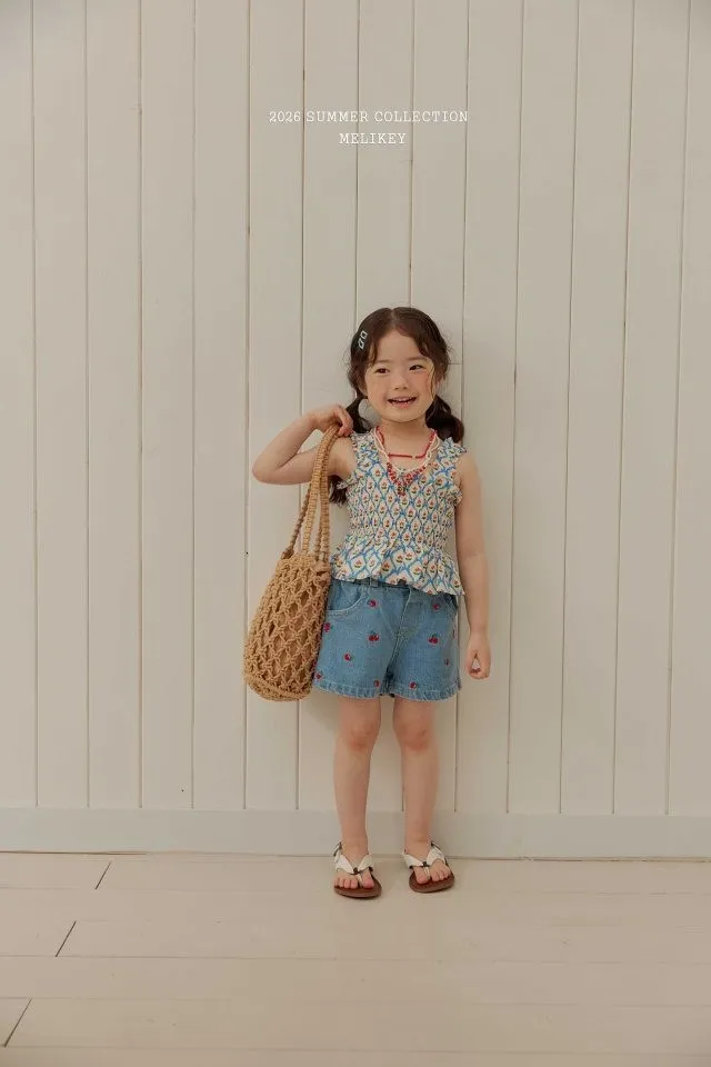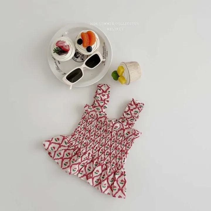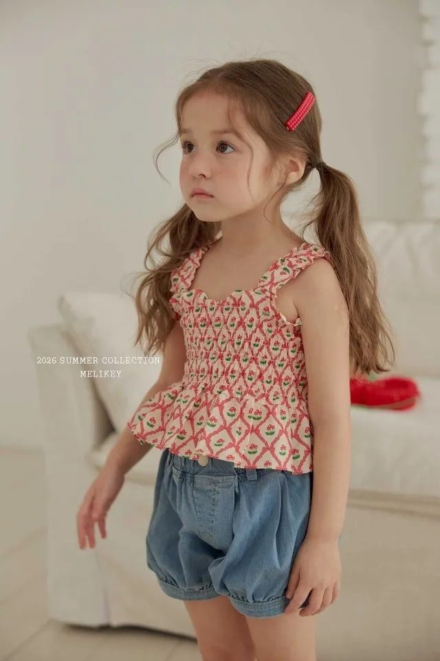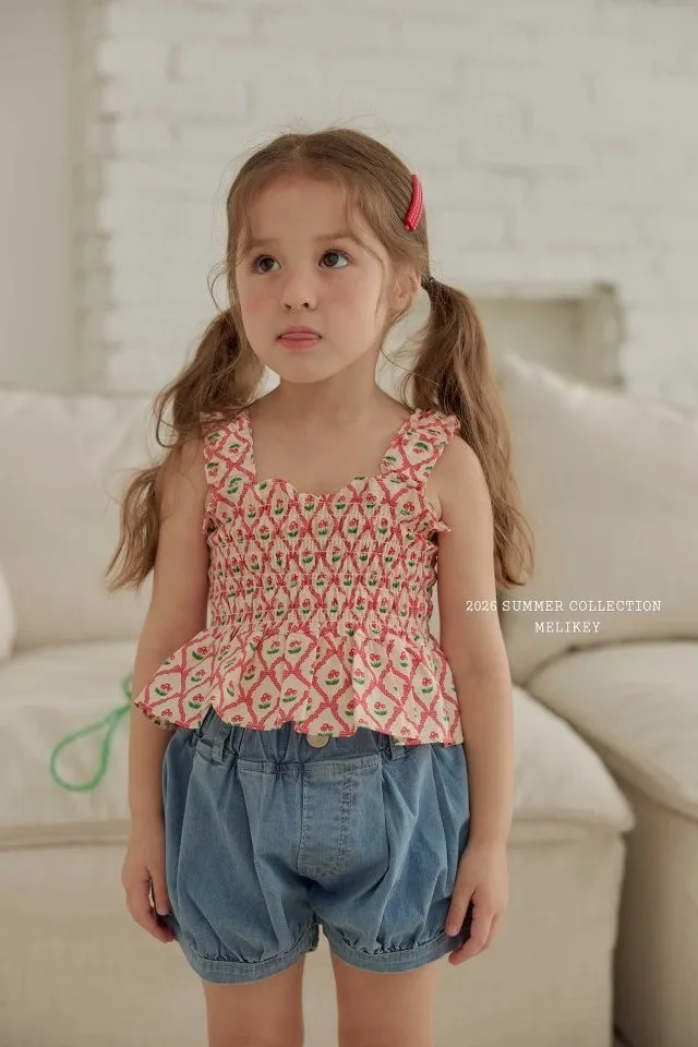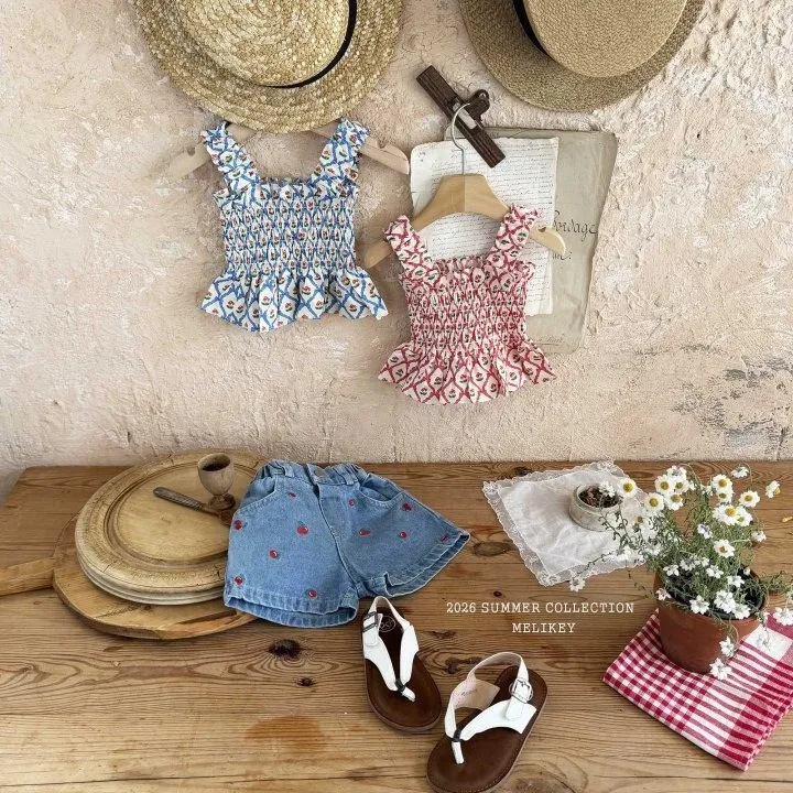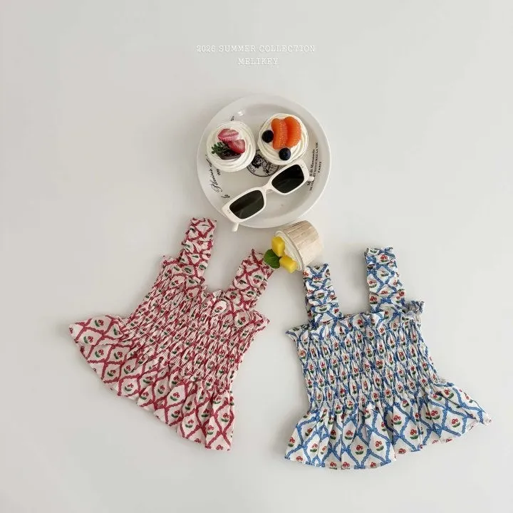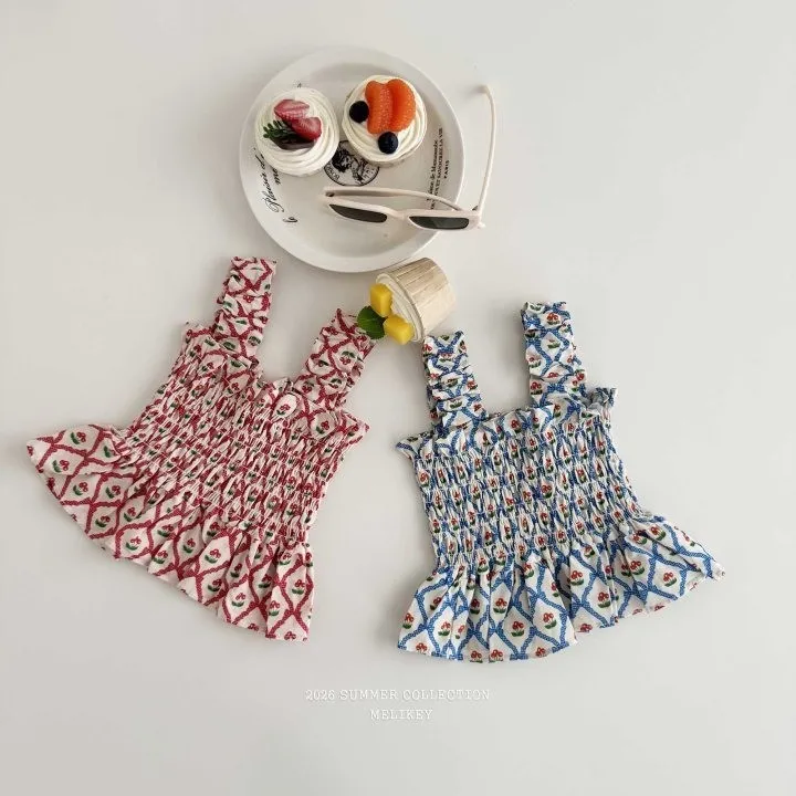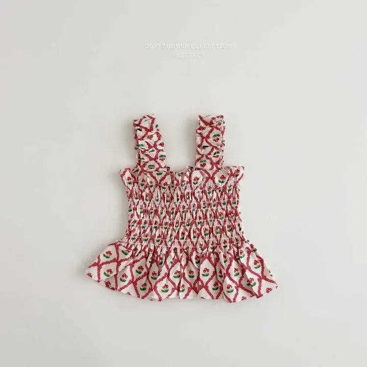 Melikey 櫻桃蝴蝶結印花多排縮褶背心