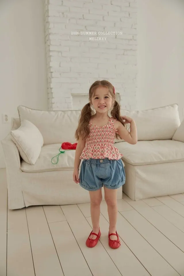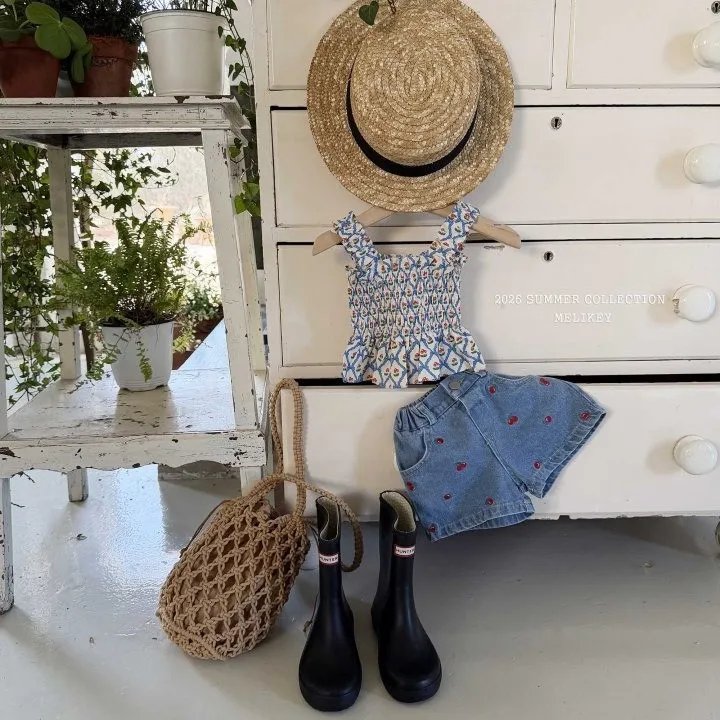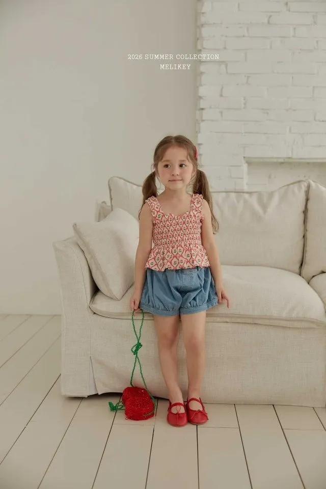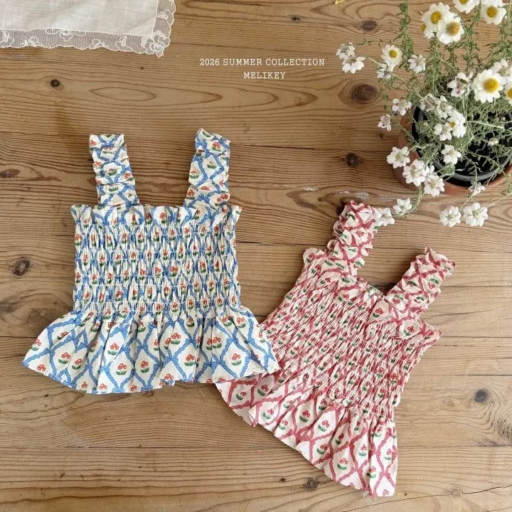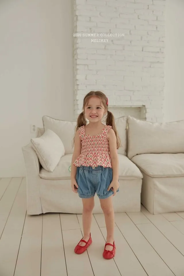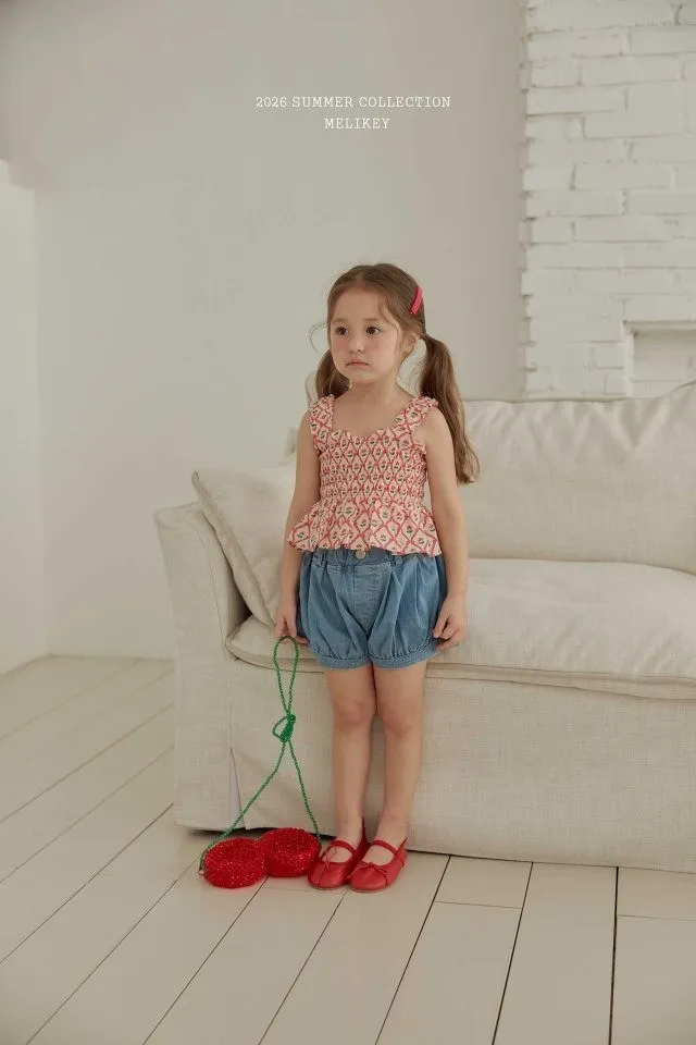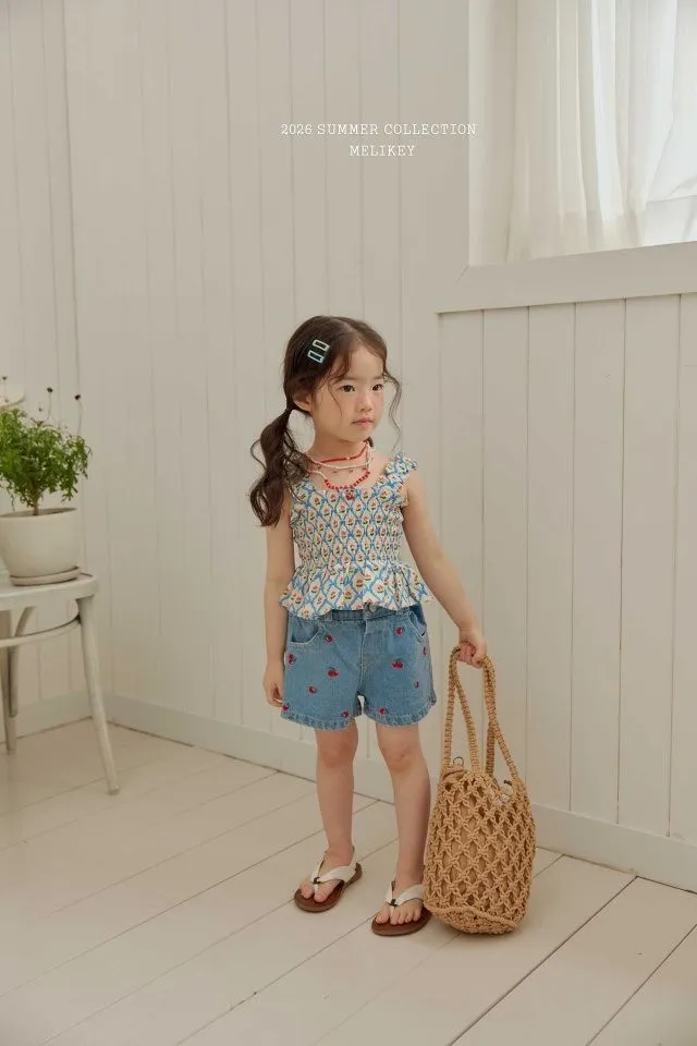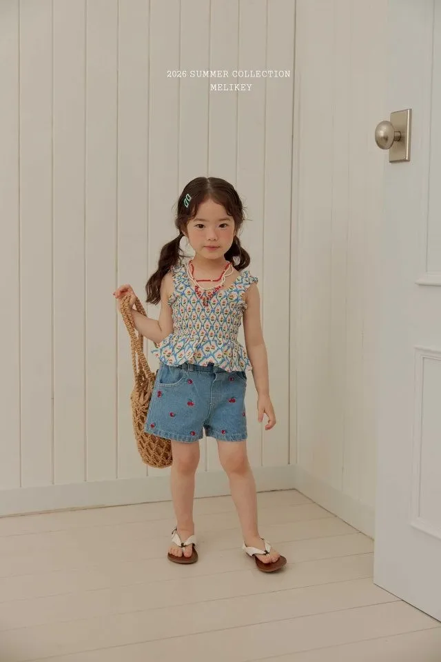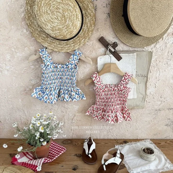Melikey 櫻桃蝴蝶結印花多排縮褶背心